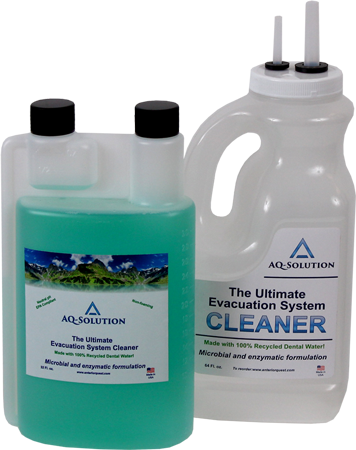 Directions for useAQ-Solution is the only evacuation line cleaner on the market that can claim to be manufactured with recycled water that comes from the industry it is trying to help. Hundreds of thousands of gallons have been captured, transported, and recycled to bring dental facilities the most environmentally friendly line cleaner on the market. In addition to the recycled water, AQ-Solution uses a combination of microbes and enzymes to help breakdown and remove the organic waste that causes blockage in vacuum lines. The helpful “bugs” are safe to the touch yet strong enough to breakdown some of the most resilient organic and solid material.